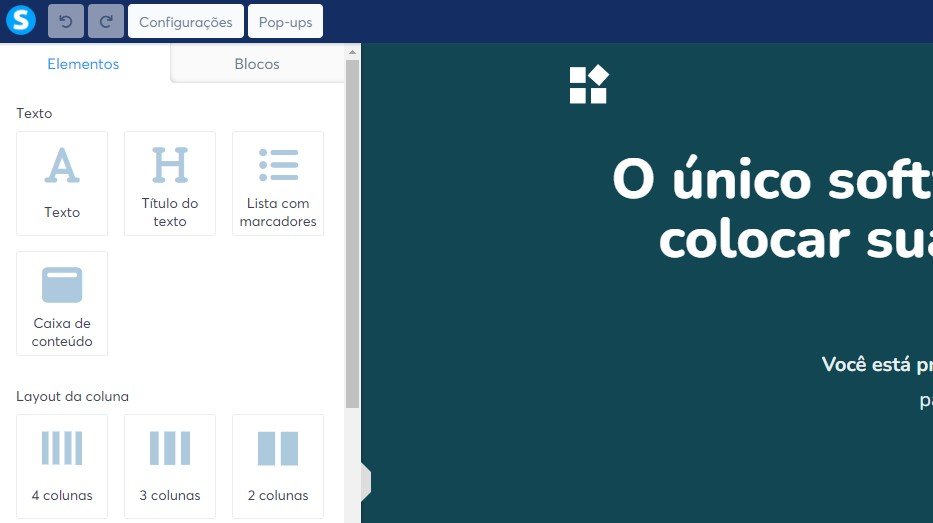 Vai abrir um editor de páginas muito parecida com a do Elementor, com elementos de texto, colunas, formulários e muito mais: